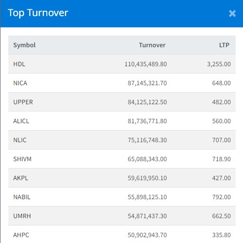 त्यस्तै, एनआइसी एशिया बैंकको ८ करोड ७१ लाख, अपर तामाकोशीको ८ करोड ४१ लाख, एशियन लाइफको ८ करोड १७ लाख र नेपाल लाइफको ७ करोड ५१ लाख रुपैयाँ भन्दा माथिको कारोबार भएको छ ।