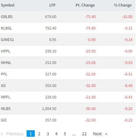 त्यस्तै, किसान लघुवित्त, ग्लोबल आइएमई समुन्नत १, हिमालयन पावर पार्टनर, माउन्ट्रोन हाईड्रो, पोखरा फाइनान्स, आईजीआई, मल्टिप्रापेज, मानुषी लघुवित्त र जनरल इन्स्योरेन्स कम्पनीको शेयर मूल्य घटेको छ।
