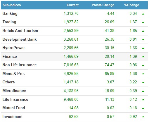 त्यस्तै, नेप्सेमा रहेका सबै उपसूचकमा आज हरियाली छाएको छ । सर्वाधिक प्रतिशतका आधारमा होटल तथा पर्यटन समूहको १.६५ प्रतिशतले बढ्न पुगेको छ भने रुपैयाँका आधारमा उत्पादन तथा प्रशोधन समूहको ६५.८९ रुपैयाँले बढ्न पुगेको छ ।