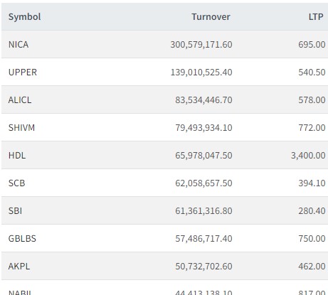 त्यस्तै, अपर तामाकोशी, एशियन लाइफ, शिवम् सिमेन्ट्स, हिमालयन डिष्टिलरी, स्टान्डर्ड च्याटर्र बैंक, नेपाल एसबिआई बैंक, ग्रामीण विकास बैंक, अरुण काबेली र नबिल बैंकको सर्वाधिक कारोबार भएको छ ।