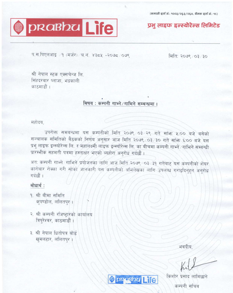 प्रभु लाइफ र महालक्ष्मी लाइफको असार २९ गते बसेको संचालक समितिको बैठकको निर्णयअुनसार असार ३० गते साँझ ६ बजे दुवै कम्पनीबीच सहमतिपत्र (एमओयू)मा हस्ताक्षर भएसँगै नेप्सेले आजदेखि सो कम्पनीको शेयर कारोबार रोक्का गरेको हो ।