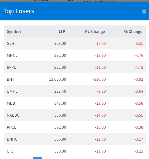 त्यस्तै, माउन्टेन हाइड्रोको ४.७६ प्रतिशत, रिभर फल्सको ४.७२ प्रतिशत, बोटलर्स नेपालको ३.९२ प्रतिशत र युनाइटेड इदि मार्दिको ३.६४ प्रतिशत अंकले घटेको छ ।