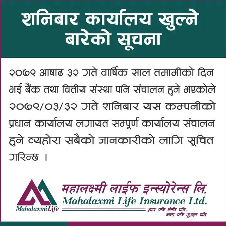 कम्पनीले आज एक सूचना प्रकाशित गर्दै २०७९ साल असार ३२ गते वार्षिक साल तमामीको दिन भई बैंक तथा वित्तीय संस्था पनि संचालन हुने भएकोले सोही दिन महालक्ष्मी लाइफको केन्द्रीय कार्यालय सहितका सबै शाखा कार्यालयहरु संचालन हुने जनाएको हो ।