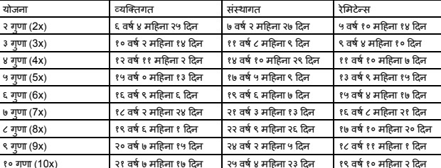 यस योजनामा निक्षेपकर्ताहरूले ५ वर्ष १० महिना देखि १९ वर्ष १० महिनासम्म मुद्दती खातामा रकम जम्मा गरे अनुुसार दुई गुणा देखि १० गुणा सम्म निक्षेप रकम फिर्ता पाउनेछ भने आफूले निक्षेप गरेको रकम र पाकेको ब्याज गरी कुल रकमको ८० प्रतिशत बराबर कर्जा समेत लिन सक्ने बैंकले जनाएको छ । योजनाको विभिन्न प्रकारहरूलाई निम्नानुसार तालिकामा देखाइएको छ ।
