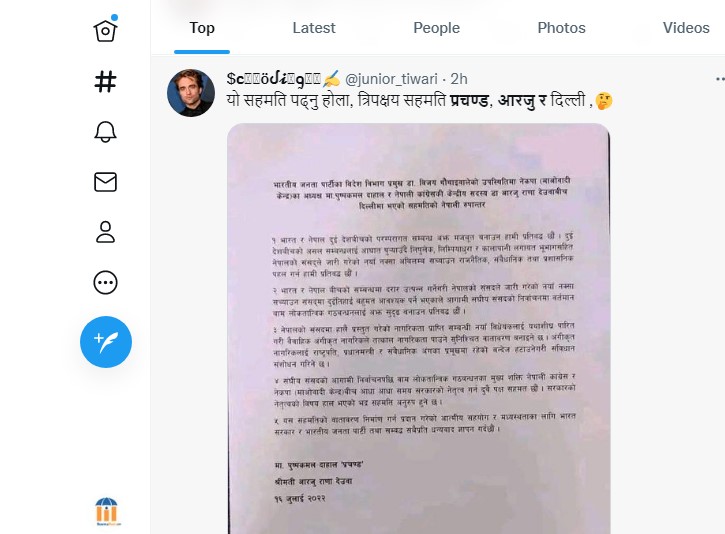 ट्वीटरमा सार्वजनिक भएको लिखित दस्तावेज अनुसार पूर्व प्रधानमन्त्री तथा नेकपा माओवादी केन्द्रका अध्यक्ष प्रचण्ड र नेपाली कांग्रेसकी नेतृ तथा प्रधानमन्त्री देउवा पत्नी आरजु राणाले यसअघि केपी ओली नेतृत्वको सरकारको पालामा संसदबाट पारित भएको चुच्चे नक्सा खारेज गर्ने प्रतिबद्धता जनाइएको छ । सो प्रतिबद्धता पूरा गर्नको लागि कांग्रेस माओवादी गठबन्धन बनाएर चुनाव लड्ने उल्लेख छ ।