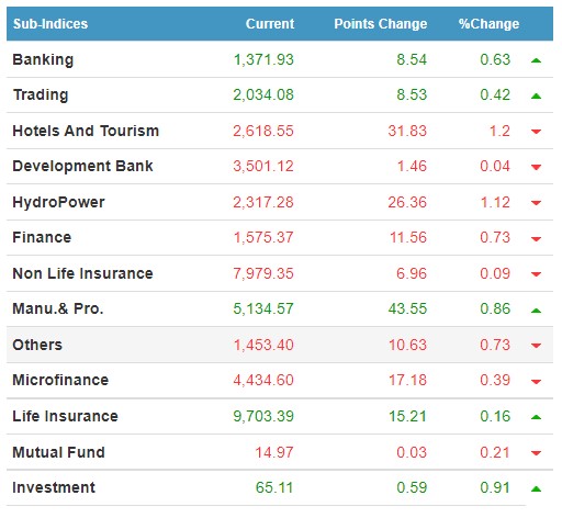नेप्सेमा रहेका १३ उपसूचकमध्ये ५ समुह बाहेकका सबै समुह आज राताम्य छन् । लगानी, जीवन बीमा, उत्पादन तथा प्रशोधन, व्यापार र बैकिङ्ग समूहमा आज हरियाली छाएको छ भने सर्वाधिक हाइड्रोपावर समूहको १.१२ प्रतिशत अर्थात् २६.३६ रुपैयाँले घट्न पुगेको छ ।