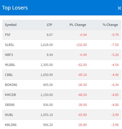 त्यस्तै, सामुदायिक लघुवित्तको ७.५० प्रतिशत, नबिल ब्यालेन्स्ड फण्ड–३ को ५.२० प्रतिशत, मिथिला लघुवित्तको ४.५४ प्रतिशत र छिमेक लघुवित्तको ४.४६ प्रतिशतले शेयरमूल्य घट्न पुगेको छ ।