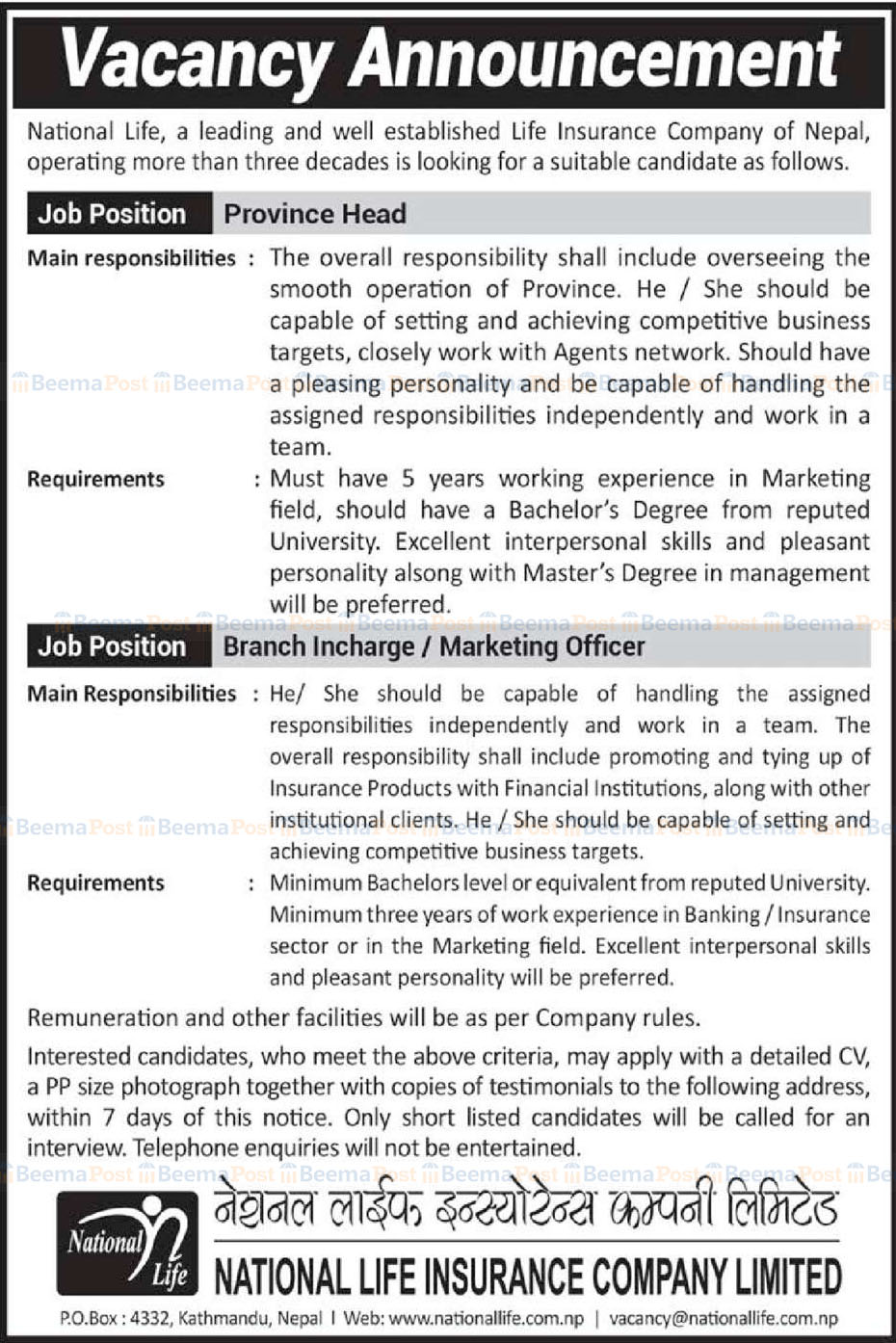 इन्स्योरेन्सले प्रोभिन्स हेड र ब्रान्च इन्चार्ज।मार्केटिङ अफिसर माग गरेको हो । उक्त पदहरुका लागि कम्पनीले न्यूनतम स्नातक तह उत्तीर्ण शैक्षिक योग्यता हुनु्पर्ने जनाएको छ ।