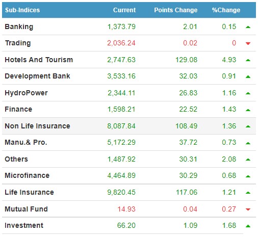 साथै नेप्सेमा रहेका १३ उपसूचक मध्ये आज म्युचुअल फण्ड र ब्यापार समूह बाहेकका सबै सूचकमा हरियाली छाएको छ । आज सर्वाधिक बीमा समूह चम्किएको छ । जीवन बीमा समूह ११७.०६ रुपैयाँ र निर्जिबन बीमा समूहको १०८.४९ रुपैयाँले बढ्न पुगेको छ ।