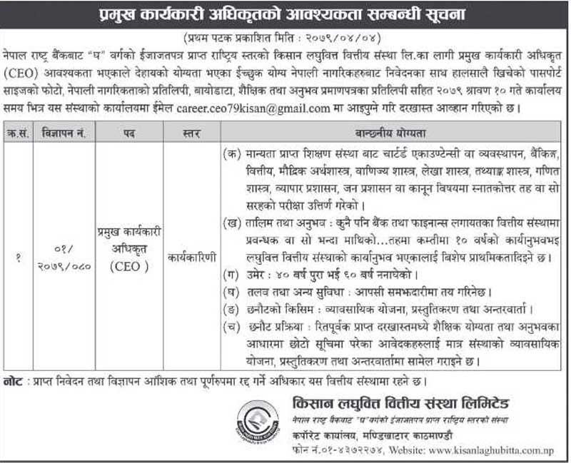 किसान लघुवित्तद्धारा सिइओ माग, कति चाहिन्छ शैक्षिक योग्यता ?