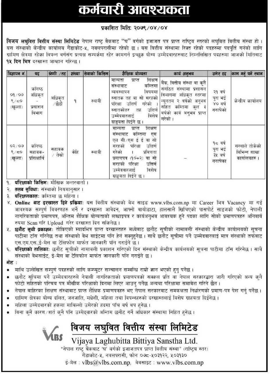 योग्यता पुगेका इच्छुक ब्यक्तिले आवश्यक कागजात संकलन गरी १५ दिनभित्र कम्पनीको वेबसाइट https://vlbs.com.np/vacancy/मार्फत दरखास्त दिन सक्नेछन् ।