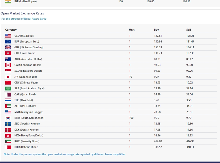 नेपाल राष्ट्र बैंकका अनुुसार आज १ अमेरिकी डलरको खरिददर १२७ रुपैयाँ ६१ पैसा र विक्रीदर १२८ रुपैयाँ २१ पैसामा नेपाली बजारमा खरिदविक्री भइरहेको छ ।