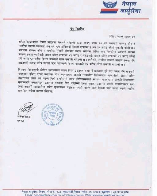 वायु सेवा निगमले न्यारोबडी जहाज खरिद बापतको ४५ करोड र वाइडबडी जहाज खरिदको लागि ४५ करोड रुपैयाँ गरी जम्मा ९० करोड किस्ता बापतको रकम भुुक्तानी गरेको छ । त्यसैगरी, नागरिक लगानी कोषको हकमा वाइडबडी जहाज खरिद गर्दाको ऋण दायित्वको किस्ता बापतको ४५ करोड रुपैयाँ समेत भुक्तानी गरेको छ ।