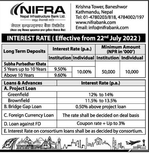काठमाडौं । नेपाल इन्फ्रास्ट्रक्चर बैंक लिमिटेड (निफ्रा)ले नयाँ ब्याजदर प्रकाशित गरेको छ । बैंकले आजैदेखि लागूहुनेगरी विभिन्न खाता तथा कर्जामा नयाँ ब्याजदर निर्धारण गरेको हो ।