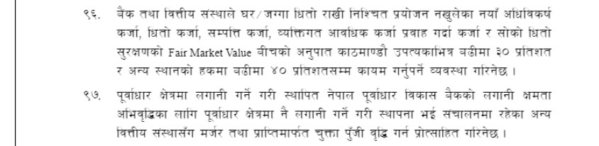 यसअघि व्यक्तिगत कर्जा, पहिचान नखुलेका कर्जाहरुमा कूल सम्पत्तिको मूल्यको ५० प्रतिशतसम्म कर्जा पाउने व्यवस्था रहेकोमा चालु आवको मौद्रिक नीतिमार्फत घरजग्गा धितो राखेर लिइने ऋणमा कडाई गर्ने निर्णय गरेको हो ।