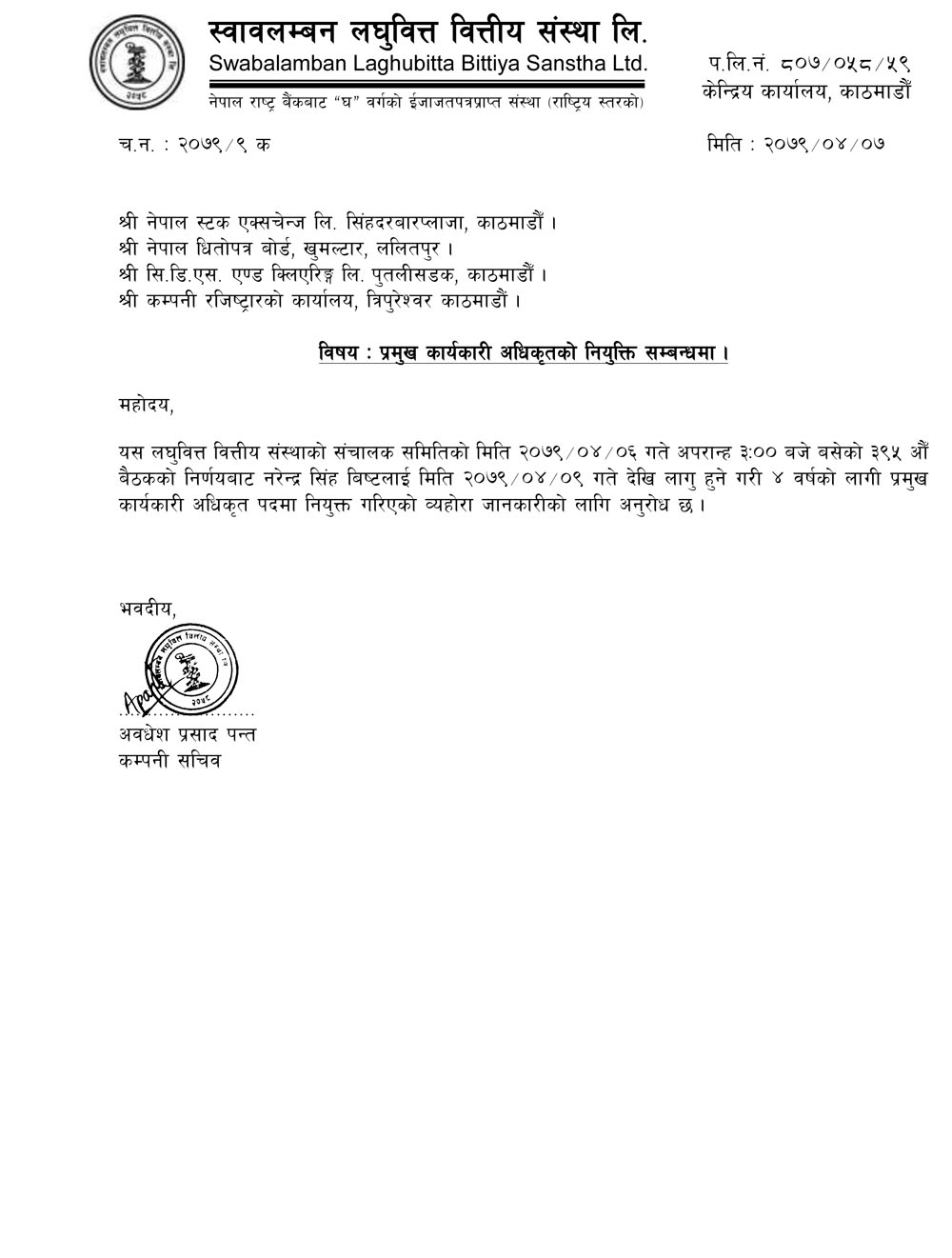 काठमाडौं । स्वावलम्बन लघुवित्त वित्तीय संस्था लिमिटेडको प्रमुख कार्यकारी अधिकृत (सिइओ)मा नरेन्द्र सिंह विष्ट नियुक्त भएका छन् ।