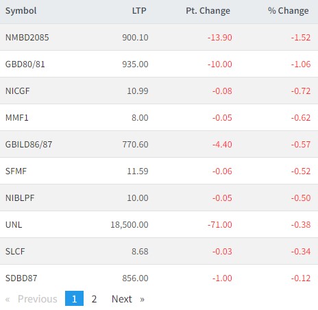 एनएमबि डिभेञ्चर २०८५, ग्लोबल आइएमई बैंकको डिभेञ्चर ८५, एनआईसी एशिया ग्रोथ फण्ड, ग्लाबल आइएमई बैंकको डिभेञ्चर ८७, सनराईज फस्र्ट म्युचुअल फण्डm एनआईबिएल प्रगति फण्ड, युनिर्भसल नेपाल, सानिमा लार्ज क्यापिटल फण्ड र सानिमा बैंकको डिभेञ्चर ८७ को मूल्य घटेको छ ।