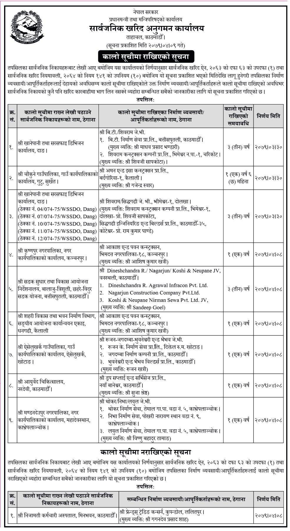 अनुगमन कार्यालयका अनुसार उक्त कम्पनी तथा निर्माण व्यवसायी।आपूर्तिकलाहरुलले कालो सूचीमा राखिएको अवधिभर सार्वजनिक निकायको कुनै पनि खरिद कारबाहीमा भाग लिन सक्ने छैन ।
