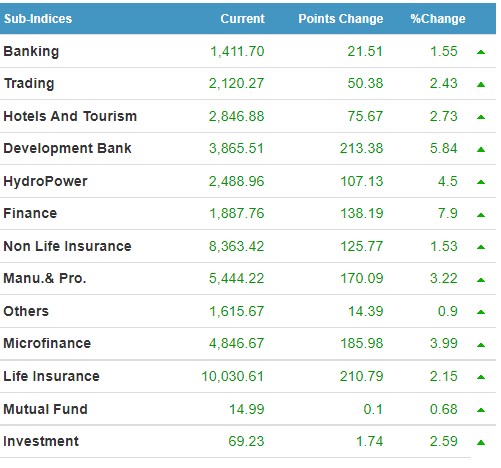 नेप्सेमा रहेका सबै सूचकमा आज चमत्कारिक बृद्धि भएको छ । सर्वाधिक प्रतिशतका आधारमा फाइनान्स सूचक ७.९ प्रतिशतले बढेको छ भने रुपैयाँका आधारमा भने विकास बैंक समूह चम्किएको छ ।