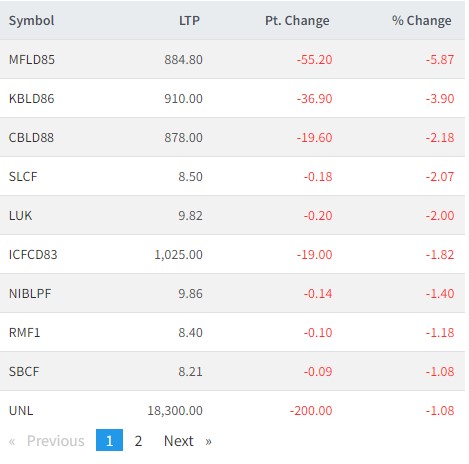 त्यस्तै, कोबिएफको डिभेञ्चर ८६, सिभिल बैंकको डिभेञ्चर ८८, सानिमा लार्ज क्याप फण्ड, लक्ष्मी उन्नती कोष, आईसीइफसी डिभेञ्चर ८३, एनआईबिएफ प्रगती फण्ड, आरबीबी म्युचुअल फण्ड १, सनराईन ब्लुचिप फण्ड र युनिलिभर नेपालको लगानीकताले सर्वाधिक गुमाएका छन् ।