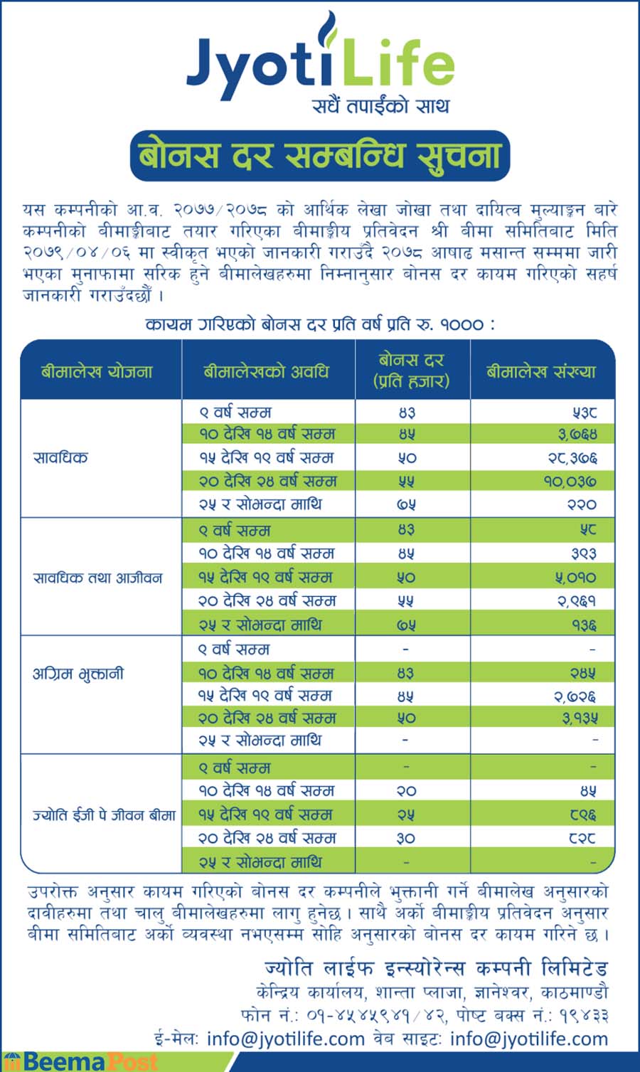 बीमा समितिबाट गत साउन ६ गते स्वीकृत भएबमोजिम ज्योति लाइफ इन्स्योरेन्सले नयाँ बोनसदर सार्वजनिक गरेको हो । उक्त बोनसदर अनुसार कम्पनीले प्रतिहजार न्युनतम २० रुपैयाँदेखि अधिकतम ७५ रुपैयाँसम्म बोनसदर निर्धारण गरेको छ । ज्योति लाइफले विभिन्न चारवटा बीमालेख योजनाअन्तर्गत बीमितहरुलाई बीमालेख अवधिअनुसार बोनसदर निर्धारण गरेको छ ।