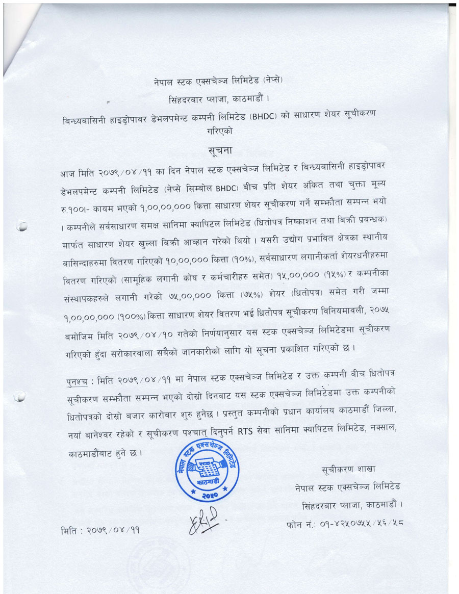 काठमाडौ । नेपाल स्टक एक्सचेञ्ज (नेप्से)मा विन्ध्यबासिनी हाइड्रोपावर डेभलपमेन्ट कम्पनी लिमिटेडको आइपीओ सूचीकृत भएको छ । कम्पनीको आइपीओ आज ‘बिएचडिसी’ सिम्बोलबाट सूचीकृत भएको हो ।