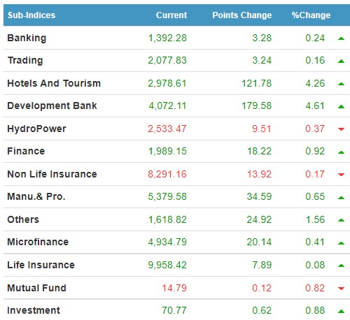 नेप्सेमा रहेका १३ उपसूचकमध्ये आज तीन सूचक बाहेकका सबै सूचकमा हरियाली छाएको छ । आज हाइड्रोपावर, निर्जिबन बीमा र म्युचुअल फण्ड सूचकमा गिरावट आएको छ भने सर्वाधिक विकास बैंक समूहको ४.६१ प्रतिशत अर्थात् १७९ रुपैयाँ ५८ पैसाले बढ्न पुगेको छ ।