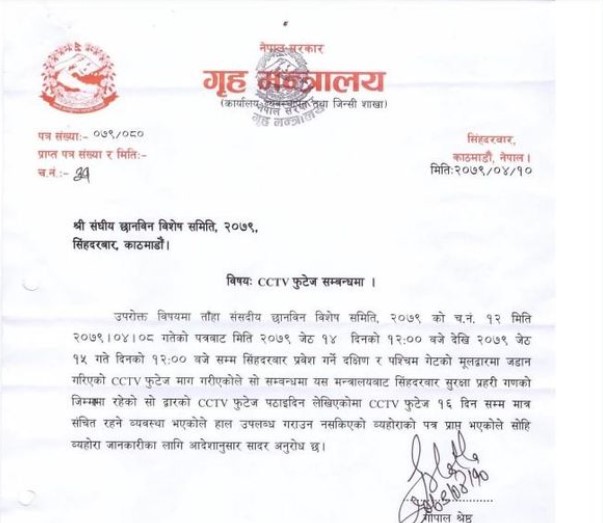 सिंहदरबारको गेटको सीसीटीभी नरहेको भन्दै गृहले पत्र संसदीय समितिलाई पठाएको हो । फुटेज १६ दिनभन्दा धेरै नरहने भन्दै गृहले संसदीय बिशेष समितिलाई उक्त पत्र पठाएको हो ।शर्मामाथि छानबिन गरिरहेको समितिले साउन ८ गते सिंहदरबारको दक्षिण र पश्चिम गेटको सीसीटीभी फुटेज मगाउने निर्णय गरेको थियो । उक्त निर्णयको जवाफ गृहले दिएको हो । छानबिन समिति बैठकले थप प्रमाण जुटाउने क्रममा जेठ १४ गते राति सिंहदरबार आउजाउ गरेकाहरू हेर्न दक्षिण र पश्चिम गेटको सीसीटीभी फुटेज मगाउने भएको थियो ।