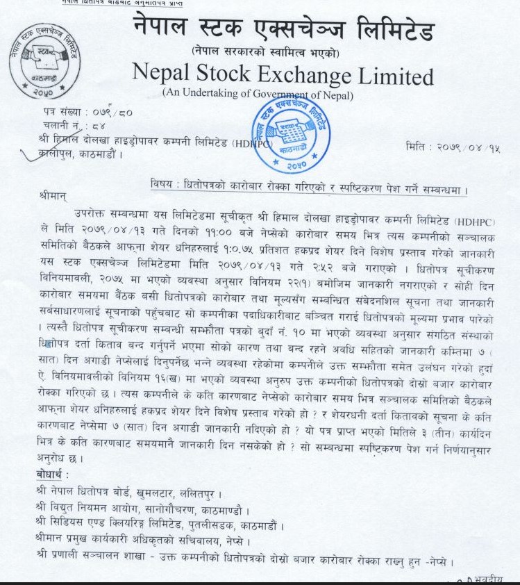 हिमाल दोलखा हाइड्रोपावरको शेयर कारोबार रोक्का, तीन दिन भित्र सपष्टिकरण दिन आग्रह