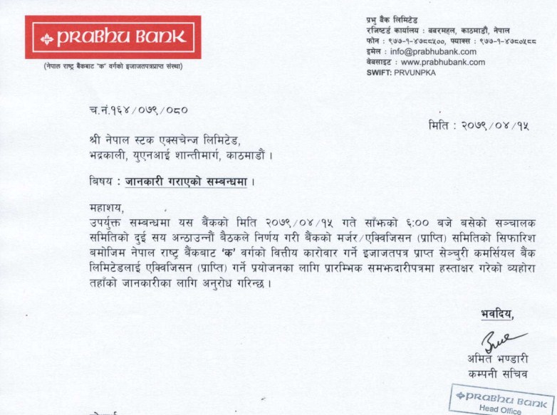 प्रभु बैंक र सेञ्चुरी कमर्सियल बैंकबीच साउन १५ गते अर्थात हिजो साँझ एकआपसमा १ः१ अनुपातमा मर्जरमा जाने एमओयूमा हस्ताक्षर भएको हो । मर्जर सम्झौतापछि प्राप्ति गर्ने भएकोले प्रभु बैंकको शेयर कारोबार रोक्का नहुने सो बैंकका सिईओ अशोक शेरचनले बताए । प्रभु बैंकले प्राप्ति गर्ने भएपछि सेन्चुरी बैंकको सेयर कारोबार रोक्का भएको छ । आजबाट नै यसको सेयर किनबेच नहुने भएको छ । दुवै बैंकले आइतबार( १ः१ अनुपातमा गाभ्ने गाभिने सम्झौता गरेका हुन् ।
