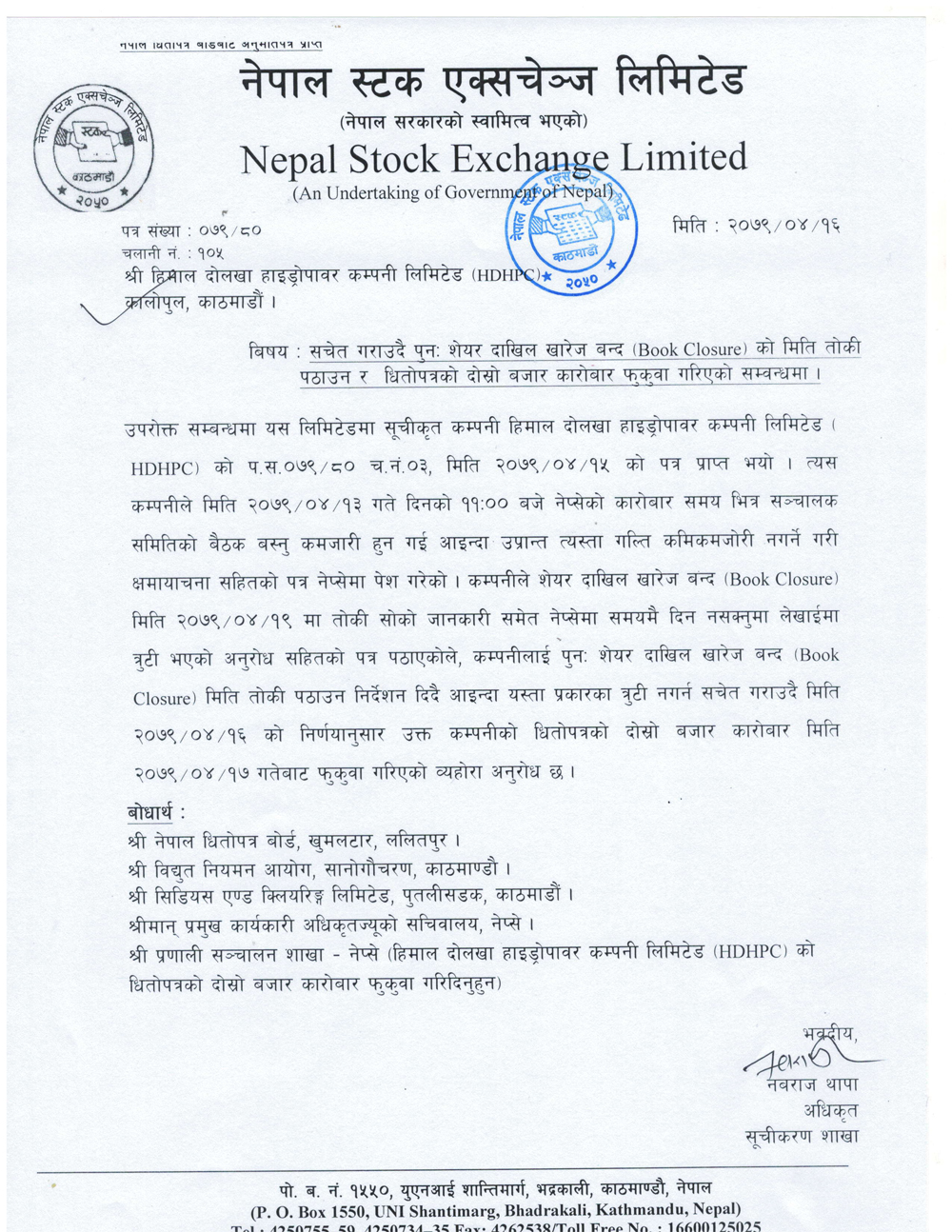 हिमाल दोलखा हाइड्रोपावरको शेयर कारोबार फुकुवा, बुकक्लोजको मिति पुनः तोक्न नेप्सेको निर्देशन