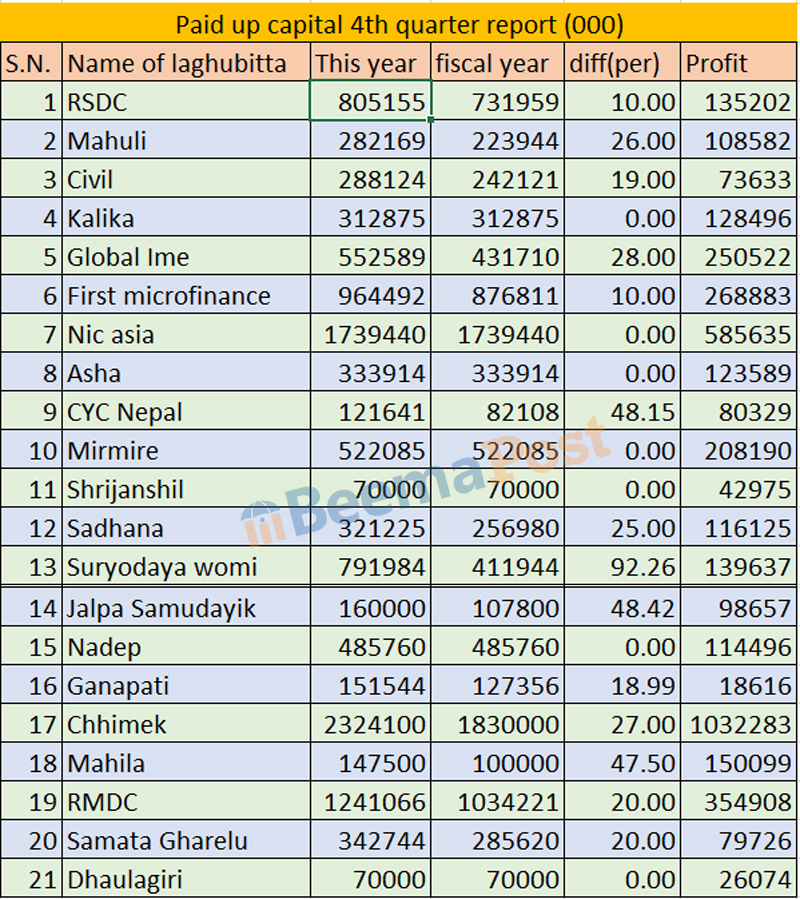त्यस्तै, ग्लोबल आइएमई लघुवित्तको २८ प्रतिशत, छिमेक लघुवित्तको २७ प्रतिशत, महुली लघुवित्तको २६ प्रतिशत, साधना लुघवित्तवको २५ प्रतिशत, आरएमडिसी र समता घरेलुको २०–२० प्रतिशत, सिभिलको १९, गणपतिको १८.९९ प्रतिशत र आरएसडिसी र फर्स्ट माइक्रोफाइनान्सको १०।१० प्रतिशतका दरले चुक्तापुँजी बढाउन सफल भएको छ । साथै यसबाहेक अन्य ७ वटा लघुवित्तको चुक्तापुँजी भने यथावत नै रहेको छ ।
