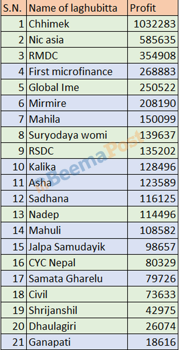 त्यस्तै, फर्स्ट माइक्रोफाइनान्सको २८ करोड ८८ लाख, ग्लोबल आइएमई लघुवित्तको २५ करोड ५ लाख, मिर्मिरे लघुवित्तको २० करोड ८१ लाख, महिला लघुवित्तको १५ करोड ९९ हजार, सूर्योदय वोमी लघुवित्तको १३ करोड ९६ लाख, आरएसडिसीको १३ करोड ५२ लाख, कालिकाको १२ करोड ८४ लाख, आशाको १२ करोड ३५ लाख, नाडेपको ११ करोड ४४ लाख, महुलीको १० करोड ८५ लाख, जाल्पा सामुदायिकको ९ करोड ८६ लाख, सिवाइसी नेपालको ८ करोड ३ लाख, समता घरेलुको ७ करोड ९७ लाख, सिभिलको ७ करोड ३६ लाख, श्रृजनशीलको ४ करोड २९ लाख, धौलागिरीको २ करोड ६० लाख र गणपतिको १ करोड ८६ लाख रुपैयाँ खुद नाफा आर्जन गरेको छ ।
