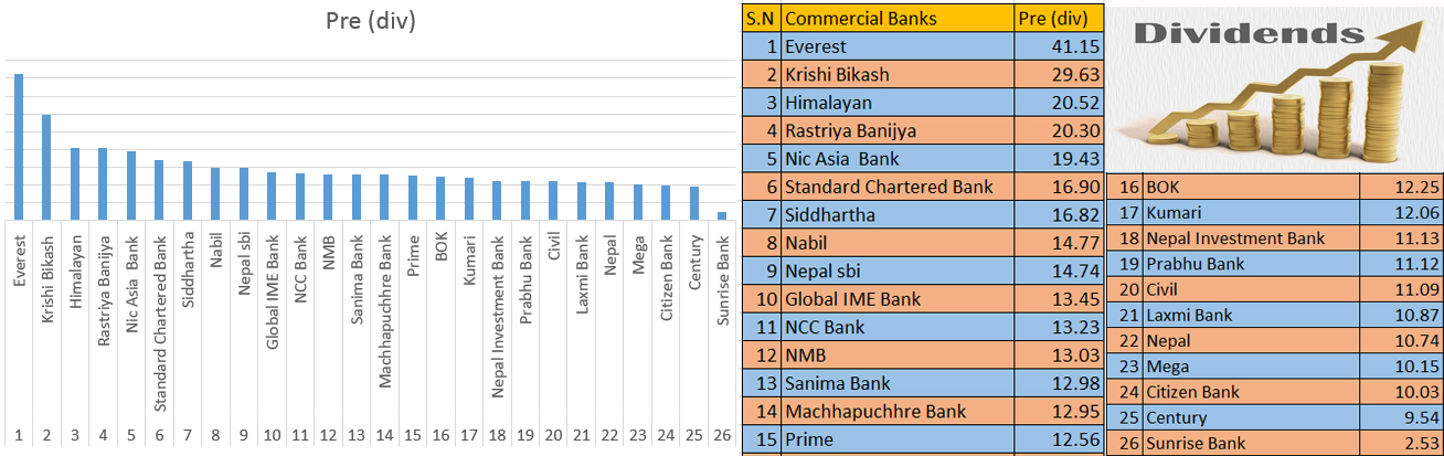 तर गत आर्थिक वर्षको वितरणयोग्य मुनाफा र पुुँजीलाई आधार मानेर हेर्ने हो भने सबैभन्दा बढी लाभांश क्षमता एभरेष्ट बैंकको रहेको छ । बैंकको चुक्तापुँजी थोरै र वितरणयोग्य नाफा धेरै भएको कारण पनि लाभांश क्षमता बढी निस्किएको हो । बैंकले शेयरधनीहरुलाई गत आर्थिक वर्षको मुनाफाबाट ४१.१५ प्रतिशत लाभांश दिन सक्ने क्षमता राख्दछ ।
