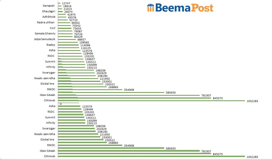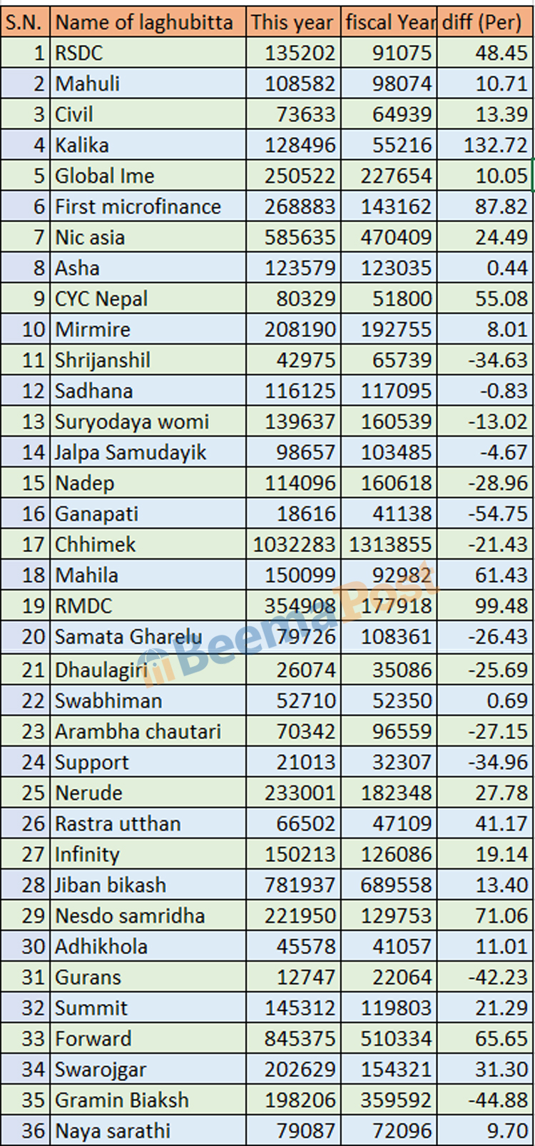 त्यस्तै, फर्स्ट माइक्रोफाइनान्सको ८७.८२ प्रतिशत, नेष्डो समृद्ध लघुवित्तको ७१.०६ प्रतिशत, फरवार्ड माइक्रोफाइनान्सको ६५.६५ प्रतिशत, महिलाको ६१.४३ प्रतिशत, सिवाइसीको ५५.०८ प्रतिशत, आरएसडीसीको ४८.४५ प्रतिशत, राष्ट्र उत्थानको ४१.१७ प्रतिशत, स्वरोजगारको ३१.३० प्रतिशत, नेरुडेको २७.७८ प्रतिशत, एनआइसी एशियाको २४.४९ प्रतिशत, समिटको २१.२९ प्रतिशत, इन्फिनिटीको १९.१४%, जीवन विकासको १३.४०%, सिभिलको १३.३९%, आँधिखोलाको ११.०१%, महुलीको १ं०.७१%, ग्लोबल आईएमईको १०.०५%, नयाँ सारथीको ९.७०%, मिर्मिरेको ८.०१%, स्वाभिमानको ०.६९% र आशाको ०.४४ प्रतिशतले ग्रोथ भएको छ ।