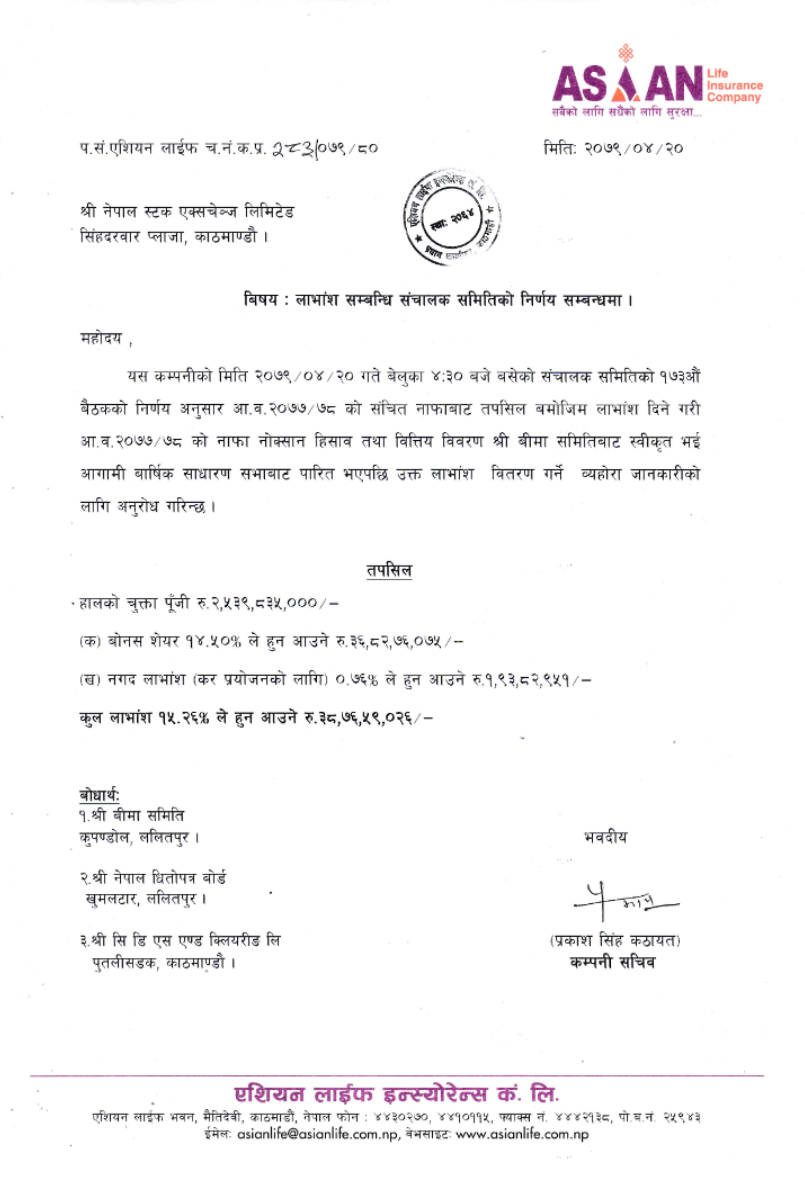 १५ प्रतिशत लाभांश दिने एशियन लाइफको घोषणा, लगानीकर्ताले साढे १४ प्रतिशत बोनस शेयर पाउने