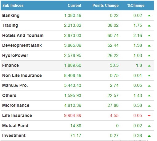 नेप्सेमा रहेका १३ उपसूचकमध्ये आज जीवन बीमा समूहको शुन्य दशमलव शुन्य ५ प्रतिशत अर्थात ४.५५ रुपैयाँले घटेको छ भने सबैभन्दा बढी होटल तथा पर्यटन समूहको २.१६ प्रतिशतले बढ्न पुगेको छ ।