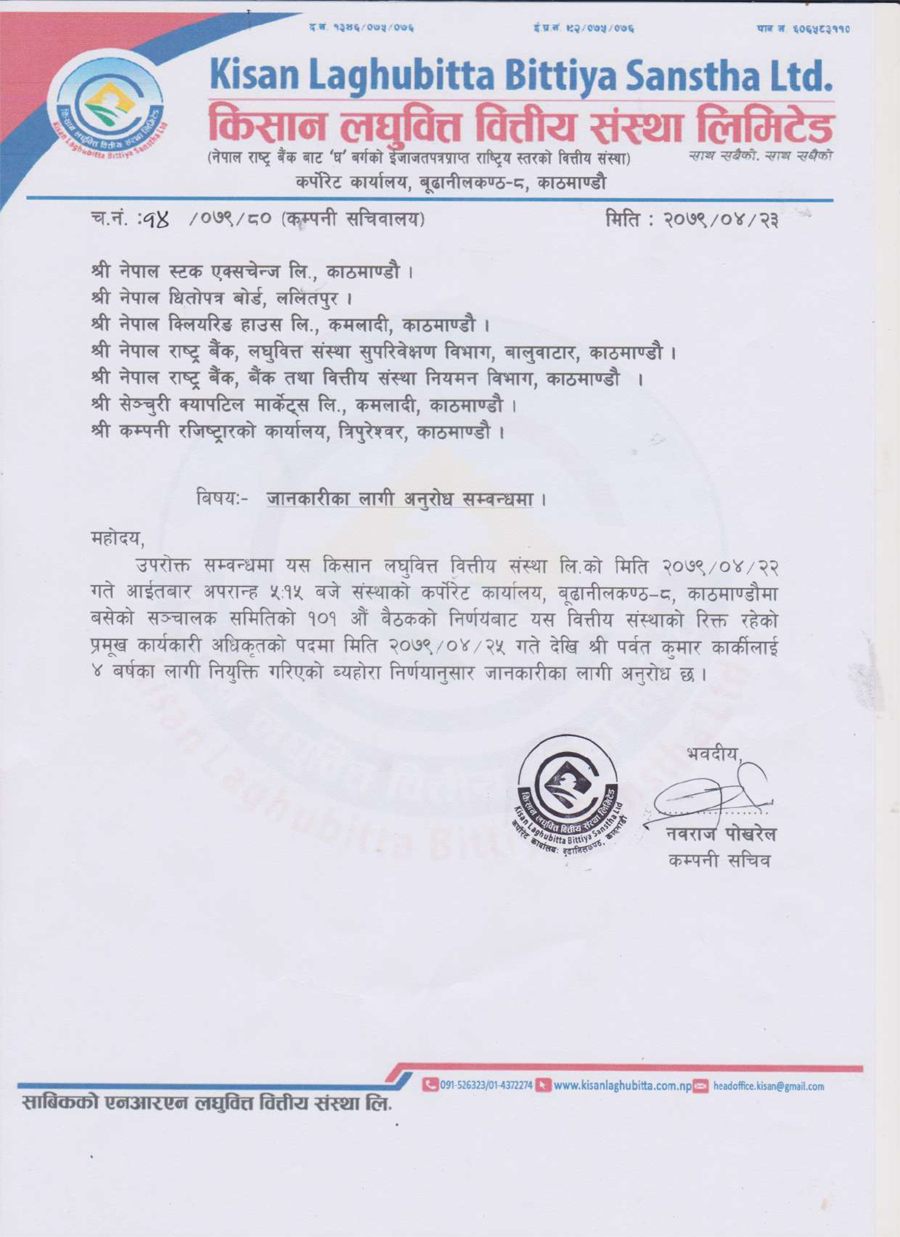 काठमाडौं । किसान लघुवित्त वित्तीय संस्था लिमिटेडको प्रमुख कार्यकारी अधिकृत (सिइओ)मा पर्वत कुमार कार्की नियुक्त भएका छन् ।