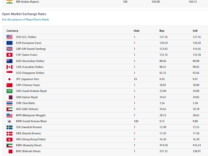 त्यस्तै, १ युरोपियन युुरो डलरको नेपाली बजारमा १२९ रुपैयाँ ५९ मा खरिद भईरहेको छ भने १३० रुपैयाँ २० पैसामा विक्री भईरहेको छ । युके पाउन्डलाई १५३ रुपैयाँ ८३ पैसामा खरिद र १५४ रुपैयाँ ५६ पैसामा बिक्रि भईरहेको छ ।