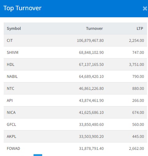 त्यस्तै, शिवम् सिमेन्ट्को ६ करोड ८८ लाख, हिमालयन डिस्टिलरीको ६ करोड ७१ लाख, नबिल बैंकको ६ करोड ४६ लाख, एनटिसिको ४ करोड ६८ लाख माथिको कारोबार भएको छ ।