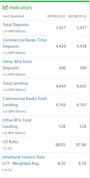 केन्द्रीय बैंकले सार्वजनिक गरेको विवरणअनुसार बैंक तथा वित्तीय संस्थाको निक्षेप साउन २४ गतेसम्म ५० खर्ब २७ अर्ब रुपैयाँ रहेको छ । अघिल्लो दिन अर्थात् साउन २३ गतेसम्म बैंकहरुको निक्षेप ५० खर्ब ३७ अर्ब रुपैयाँ रहेको छ । दिनानुदिन बैंकहरुमा अर्बौ अर्ब निक्षेप घट्दै गइरहेको छ ।