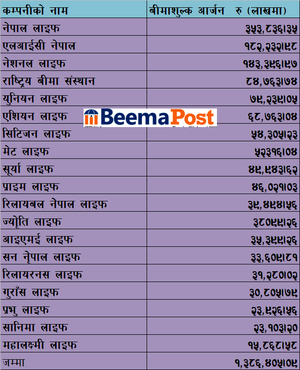 बीमा समितिको तथ्याङ्क अनुसार राष्ट्रिय बीमा संस्थानले ८ अर्ब ४७ करोड रुपैयाँ, युनियनले ७ अर्ब ९२ करोड रुपैयाँ, एशियन लाइफले ६ अर्ब ८७ करोड रुपैयाँ, सिटिजन लाइफले ५ अर्ब ४३ करोड रुपैयाँ, मेट लाइफले ५ अर्ब २३ करोड रुपैयाँ, सूर्या लाइफले ४ अर्ब ९९ करोड रुपैयाँ, प्राईम लाइफले ४ अर्ब ६० करोड रुपैयाँ कुल बीमाशुल्क आर्जन गर्न सफल भएका छन् ।