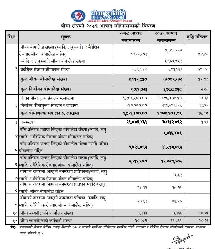 बीमा समितिको तथ्याङ्क अनुसार कूल बीमा पोलिसी एक करोड ३० लाख ९९ हजार ६३२ वटा बीमा पोलिसी बिक्री भएको छ । सो बीमा पोलिसीबाट पाँच प्रतिशत डुप्लिकेशन संख्या घटाएर बीमाको दायरामा आउनेको प्रतिशत ४१.२० पुगेको बीमा समितिले जनाएको छ ।