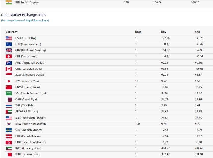 त्यस्तै, १ युरोपियन युुरो डलरको नेपाली बजारमा १३० रुपैयाँ ८७ मा खरिद भईरहेको छ भने १३१ रुपैयाँ ४९ पैसामा विक्री भईरहेको छ । युके पाउन्डलाई १५४ रुपैयाँ १७ पैसामा खरिद र १५४ रुपैयाँ ९० पैसामा बिक्रि भईरहेको छ ।