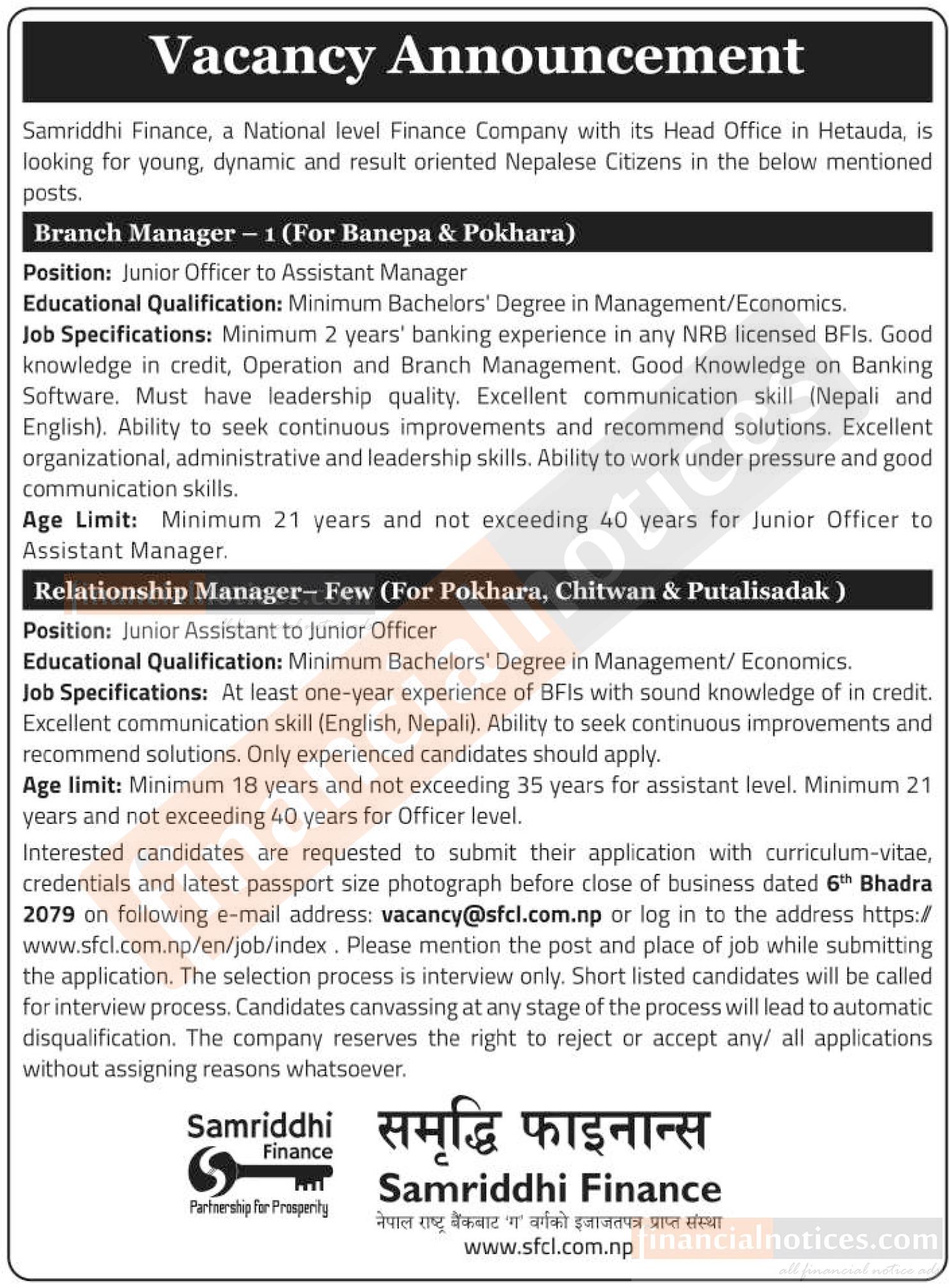 फाइनान्सले ब्रान्च म्यानेजरमा १ जना र रिलेसनसिप म्यानेजरको लागि केहि संख्यामा कर्मचारी माग गरेको छ । सो पदहरुको लागि शैक्षिक योग्यता कम्तिमा स्नात्तक तह उत्तिर्ण गरेको हुनुपर्ने जनाएको हो ।