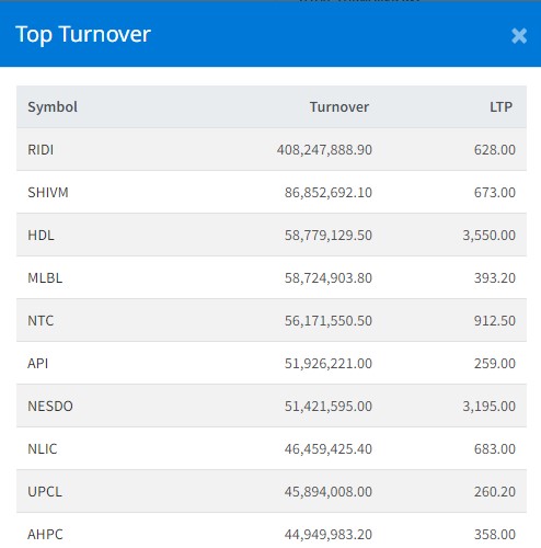 त्यस्तै, शिवम् सिमेन्ट्सको ८ करोड ६८ लाख रुपैयाँ, हिमालयन डिस्टिलरीको ५ करोड ८७ लाख, महालक्ष्मी विकास बैंकको ५ करोड ८७ लाख र एनटिसिको ५ करोड ६१ लाख रुपैयाँ माथिको कारोबार भएको छ ।