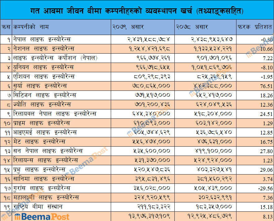 १९ जीवन बीमा कम्पनीहरुले वर्षदिनभित्र व्यवस्थापनमा खर्चिए १४ अर्ब रुपैयाँ, कसको घट्यो– कसको बढ्यो ? (तथ्याङ्कसहित)