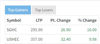 यो समाचार तयार पार्दासम्म श्वेत गंगा हाइड्रोपावरकोशेयर १० प्रतिशतले बढेर शेयरमूल्य २९५ रुपैयाँ ९० पैसा पुगेको छ भने अपर सोलुको ९.९८ प्रतिशतले बढेर शेयरमूल्य ३५७ रुपैयाँ पुगेको छ । नेप्सेले श्वेत गंगाको ओपनिङ प्राइज २६९ रुपैयाँ ६० पैसा र अपर सोलुको ३२४ रुपैयाँ ६० पैसा तोकिदिएको थियो ।