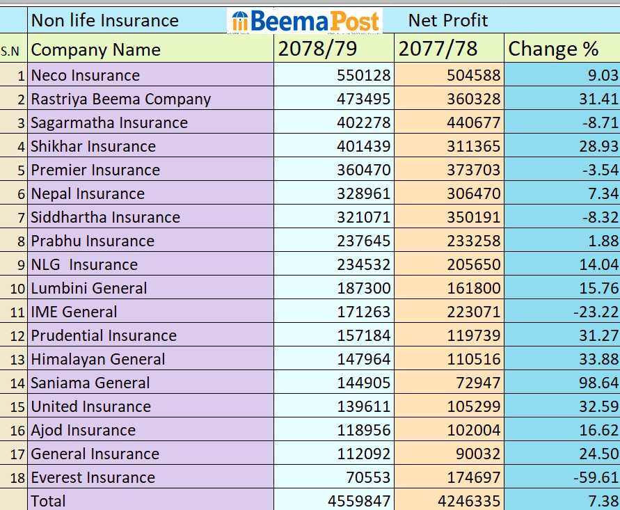 गत आर्थिक बर्षको चौथौ त्रैमासको अवधिसम्ममा निर्जीवन बीमा कम्पनीहरुको मुनाफाको आधारमा नेको इन्स्योरेन्स कम्पनी अगाडि रहेको छ। कम्पनीले गत आर्थिक बर्षको चौथौ त्रैमासको अवधिसम्ममा ५५ करोड १ लाख २८ हजार रूपैयाँ खुद मुनाफा आर्जन गर्न सफल भएका छन् । अघिल्लो आवमा नेकोले ५० करोड ४५ लाख ८८ हजार रूपैयाँ खुद नाफा कमाएको थियो ।