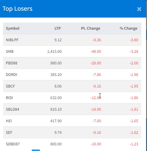 त्यस्तै, सपोर्ट माइक्रोफाईनान्सको ३।२८, प्राईम बैंकको डिबेञ्चर २, दोर्दीखोला जल बिद्युतको १।९८ र सनराईज ब्लुचिप फण्डको १।९५ अंकले शेयरमुल्य घटेको छ ।